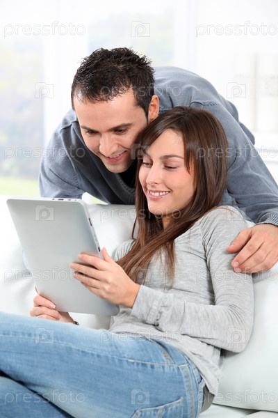 Пара, сидя на диване с электронной площадки
