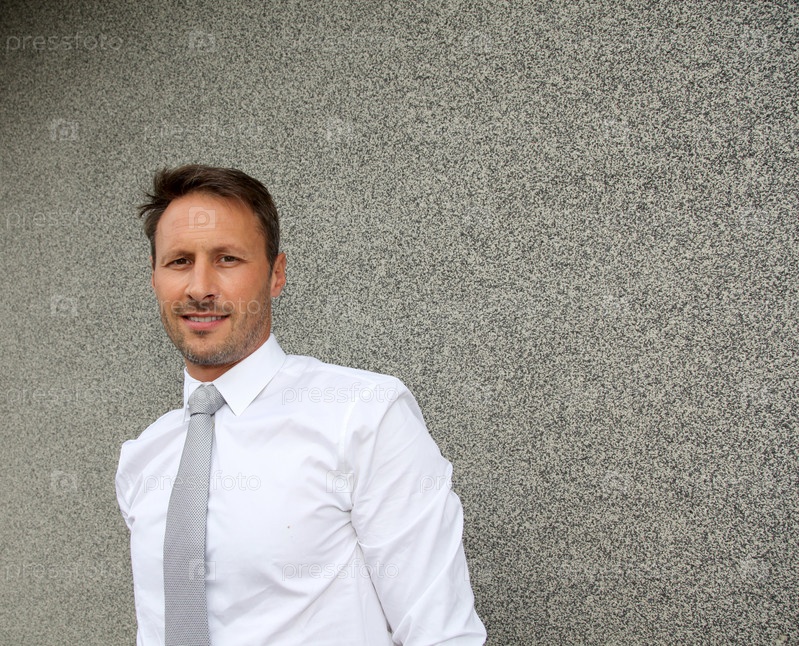 Бизнесмен, стоя против бетонная стена