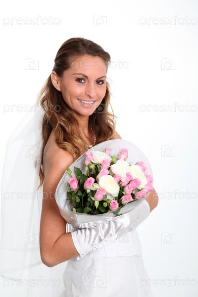 Красивая невеста, холдинг букет цветов на белом фоне