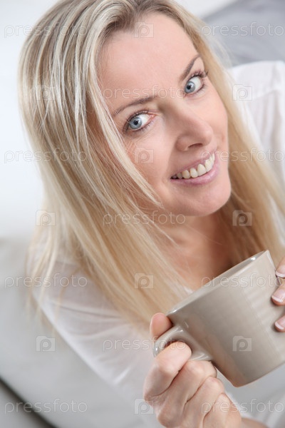 Портрет красивая блондинка женщины, пить чай