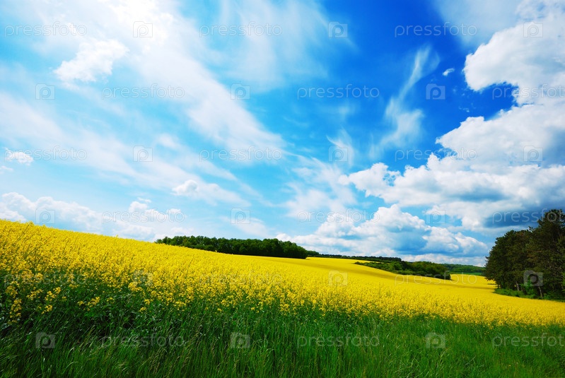 Поле рапса под ярким пасмурное небо Псаропоула сцены