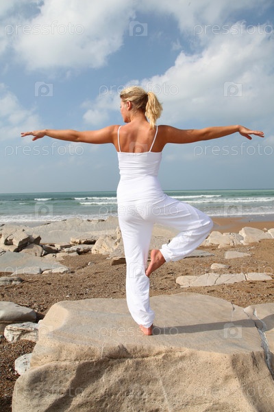 Красивая блондинка женщина практикующие йоги на пляже