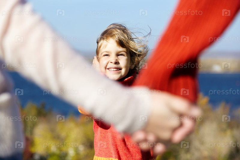 Руки родителей и маленькая девочка, глядя на них, фокус точки на лице
