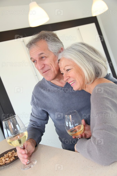 Пожилые супружеские пары, пить вино в домашней кухне
