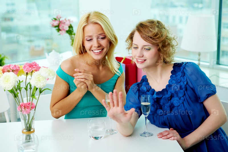 Молодая женщина демонстрирует подруге обручальное кольцо
