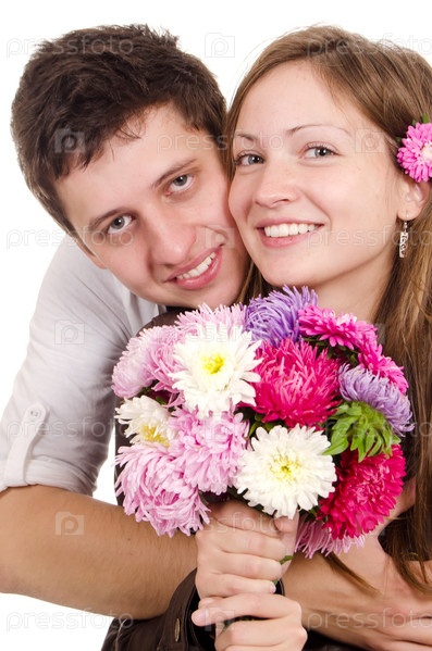 Влюбленная пара с букетом цветов