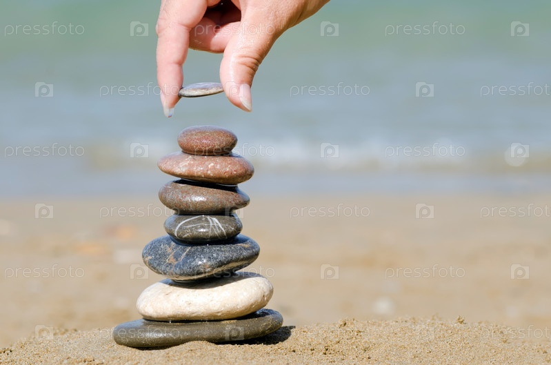Женская рука строит пирамидку из морской гальки