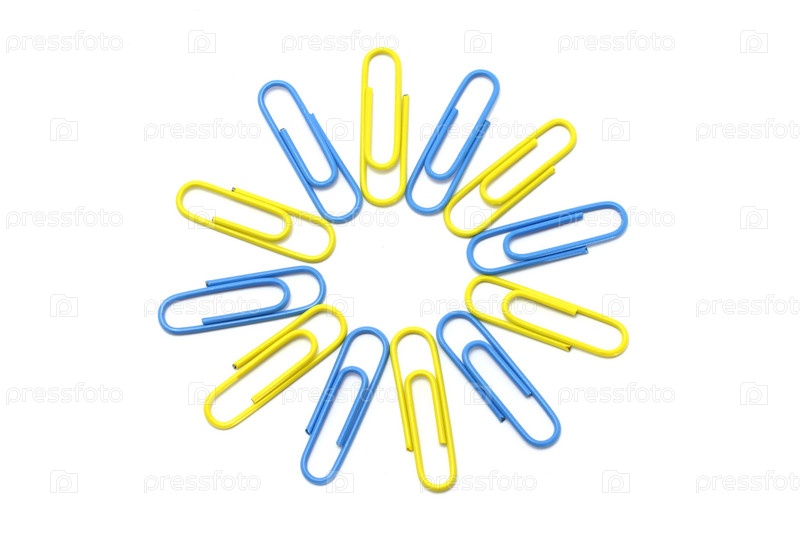 Синие и желтые скрепки расположены по кругу на белом фоне