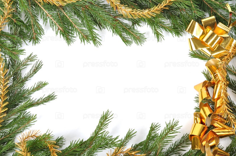 Рождественская рамка из елочных веток и золотистой мишуры на белом фоне