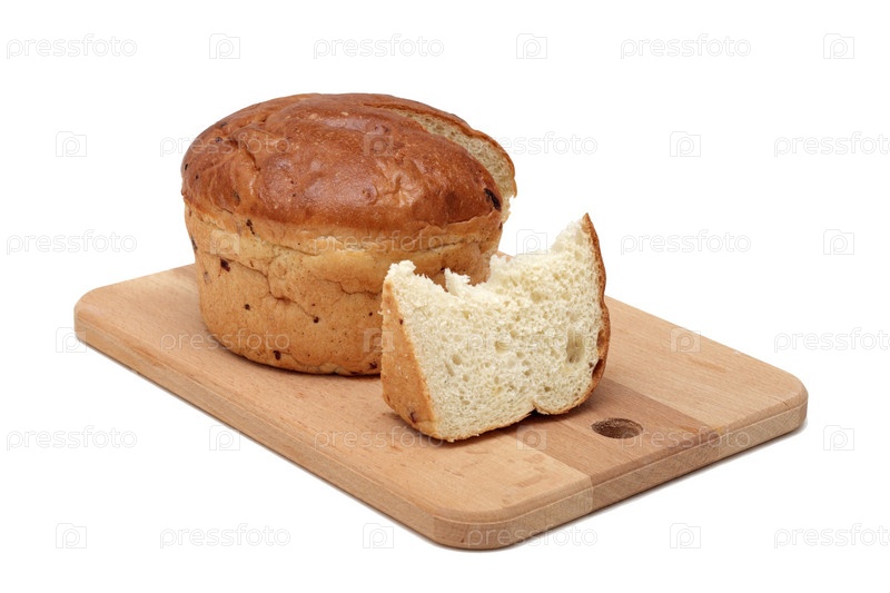 Круглый хлеб на деревянной доске, изолировано на белом фоне
