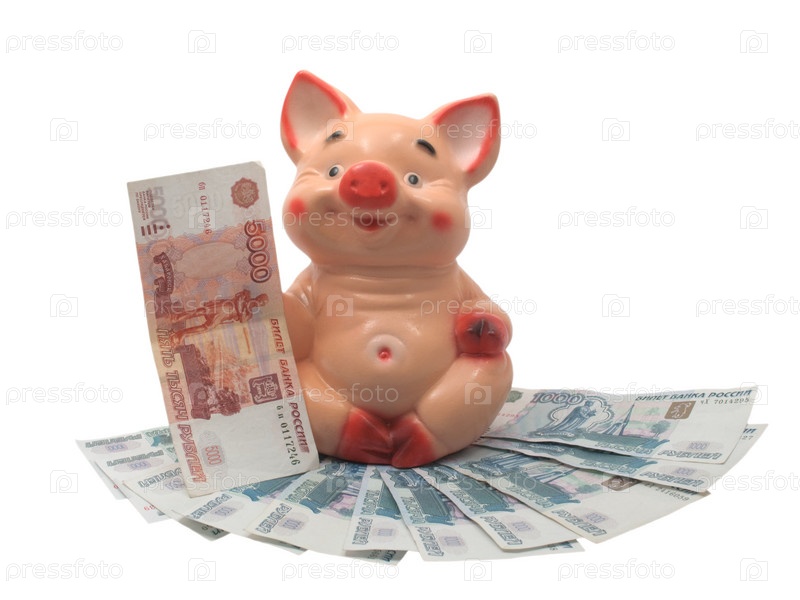 Свинья и много денег на белом фоне