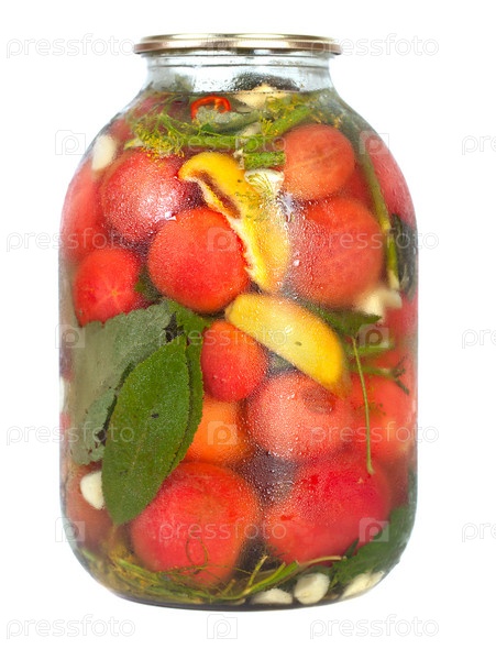Консервированные помидоры в стеклянной банке на белом фоне