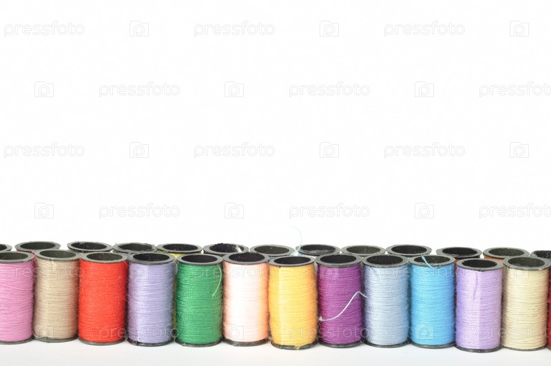 Множество катушек ниток на белом фоне