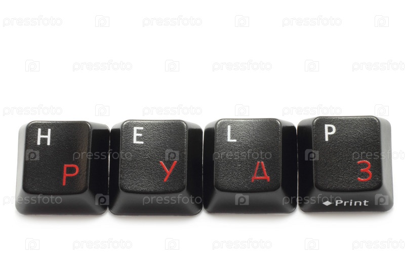 Слово "Помощь" по-английски выложено из клавиш, белый фон
