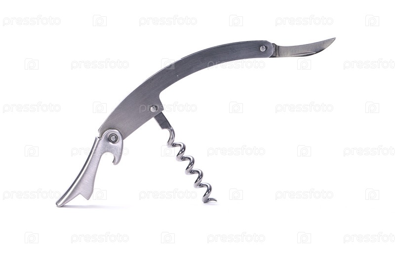 Металлический прибор для открывания емкостей на белом фоне