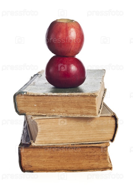 Спелые яблоки на стопке книг на белом фоне