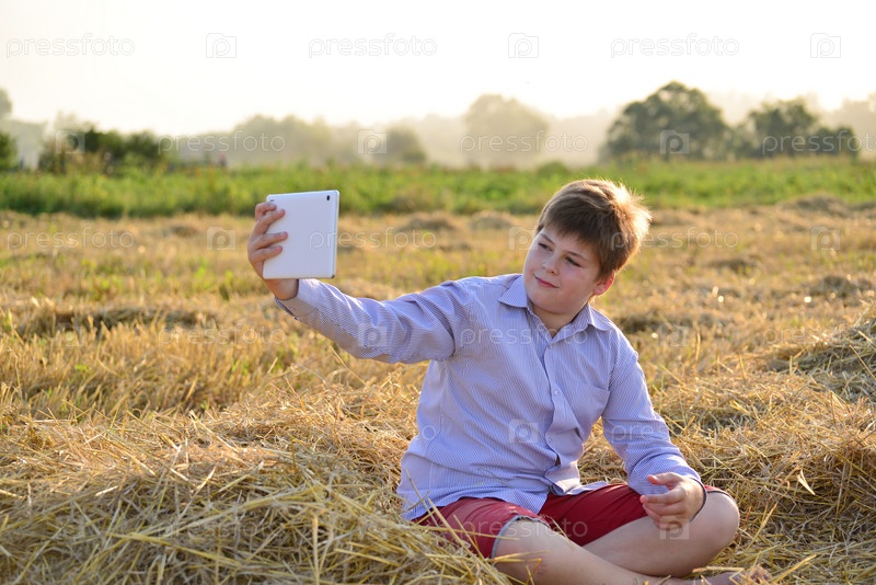 Подросток мальчик, играя на планшете в поле