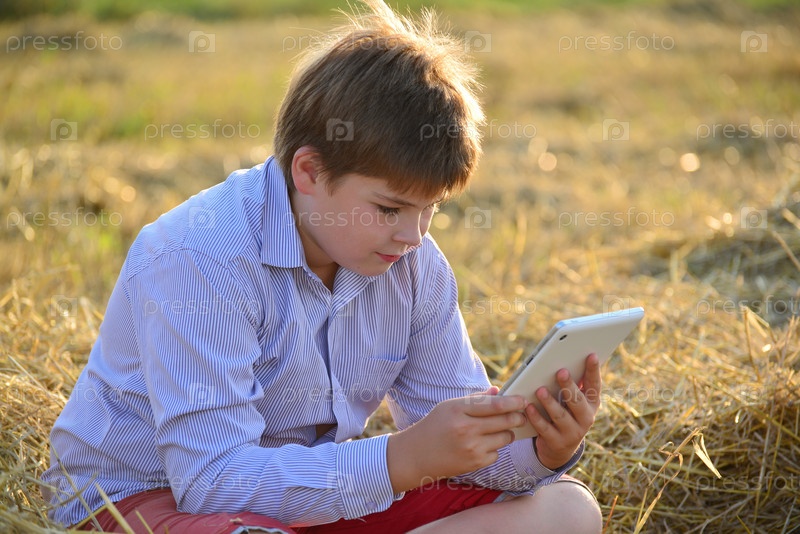 Подросток мальчик, играя на планшете в поле