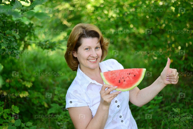 Женщина с кусочек арбуза в природе