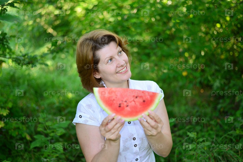 Женщина с кусочек арбуза в природе