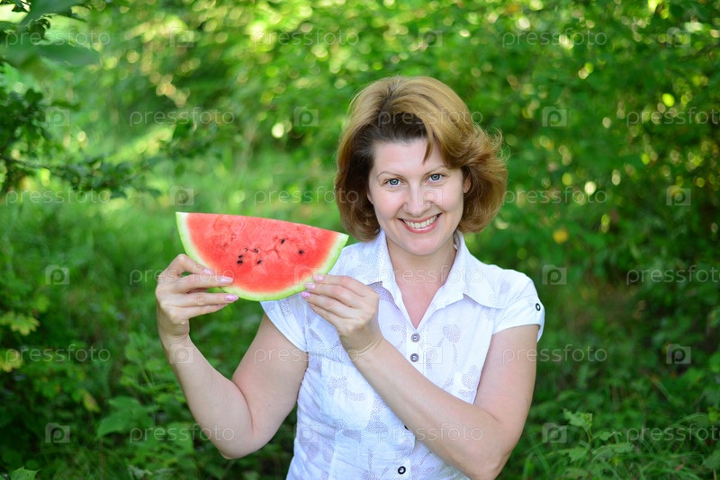 Женщина с кусочек арбуза в природе