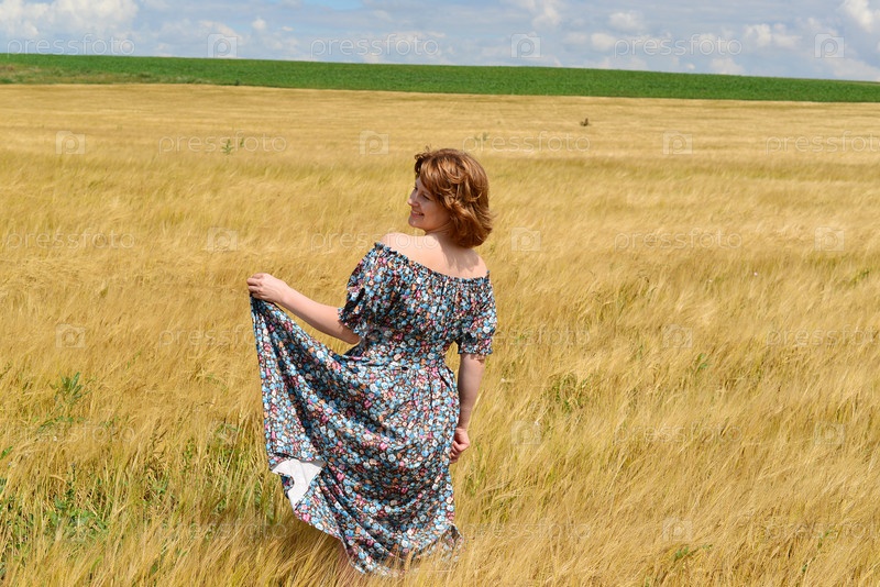 Женщина в платье макси стоя на поле ржи