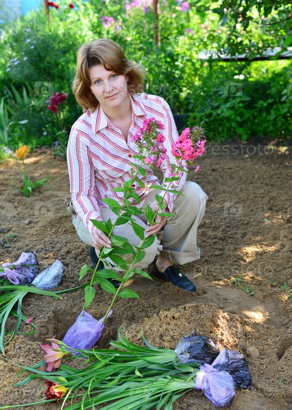 Женщина, Саженцы цветы в саду