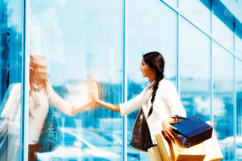 Девушка с покупками у витрины магазина
