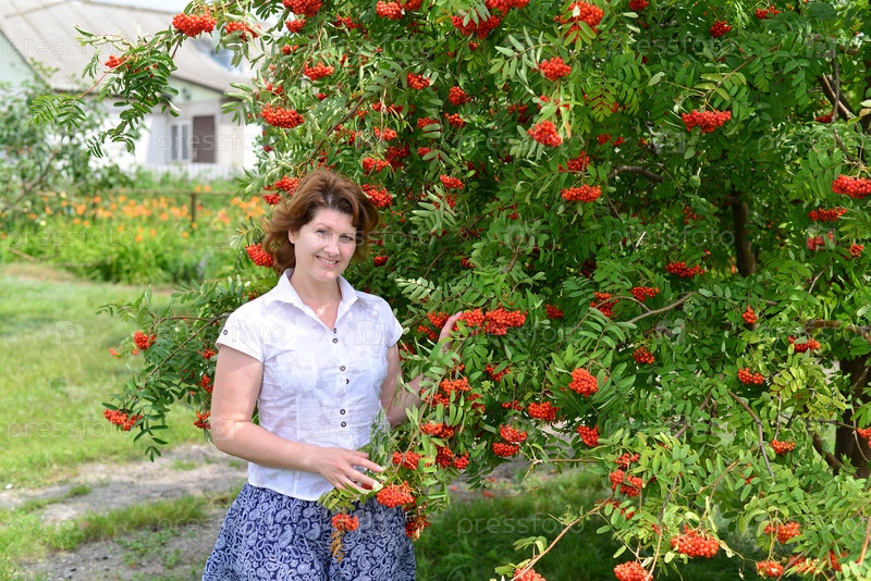Женщина стоит возле рябины в летнее время