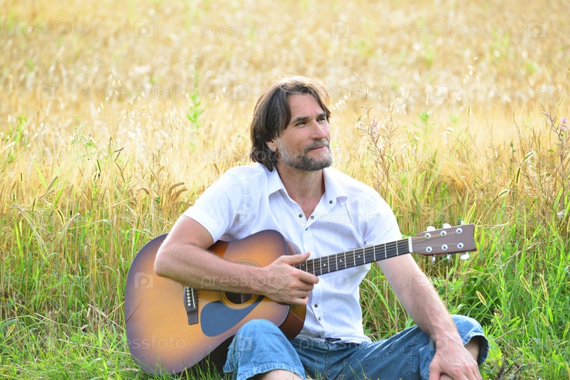 Мужчина с гитарой в поле