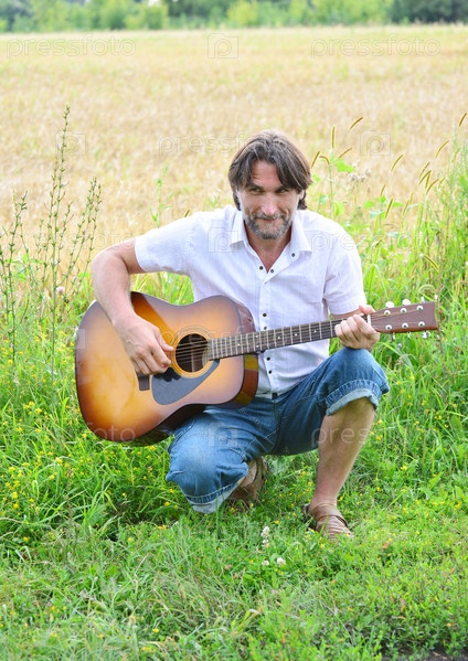 Мужчина с гитарой в поле