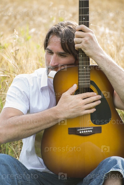 Мужчина с гитарой в поле