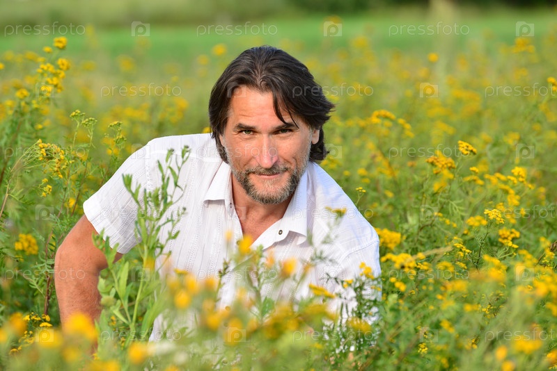 Человек, опираясь на лужайке с полевыми цветами