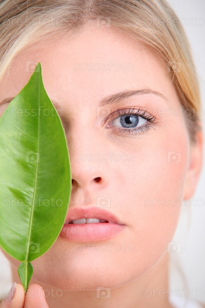 Крупным планом красивая женщина, держащая листьев зеленого растения