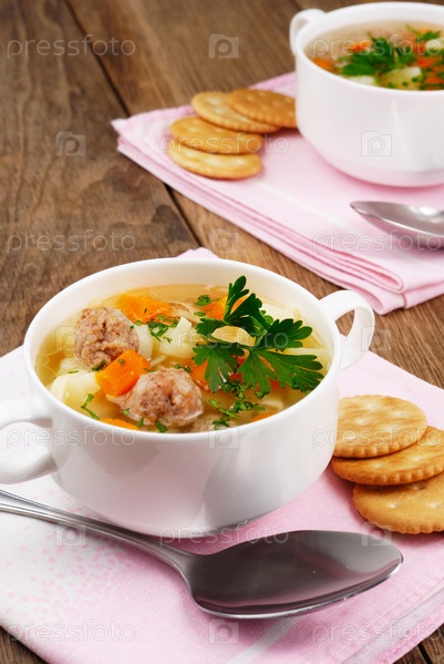 Домашний суп с фрикадельками на деревянный стол