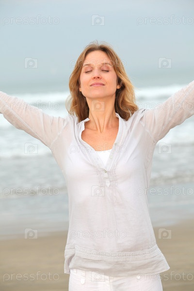 Женщина, дышать свежим воздухом на берегу моря