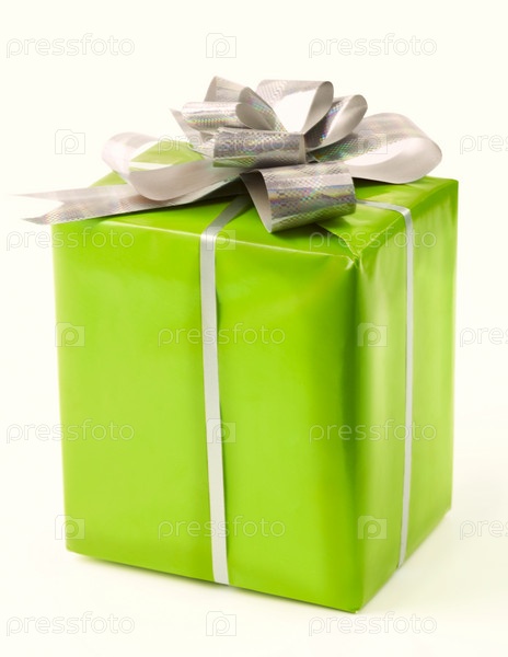 Большой подарочный ящик, ограниченный серебряной лентой и украшенный красивым узлом
