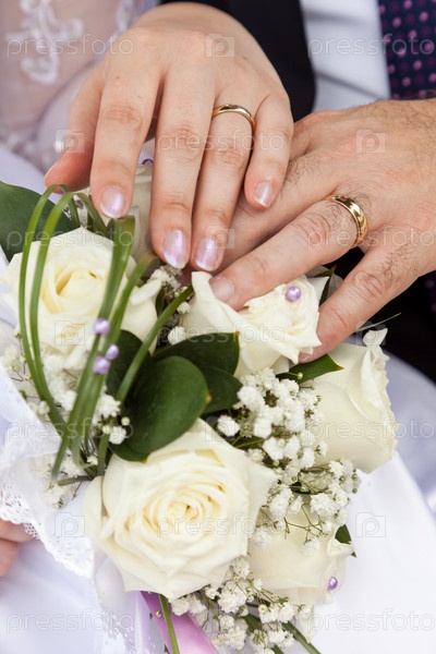 Руки молодоженов и свадебный букет