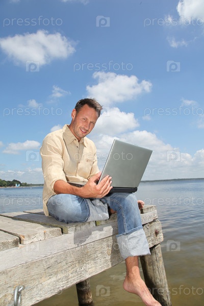 Человек, используя портативный компьютер на понтоне