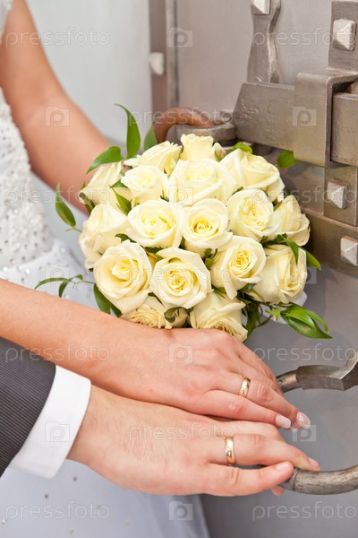 Руки молодоженов и свадебный букет