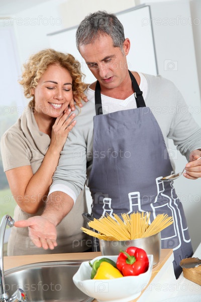Счастливая пара, подготовка итальянский ужин у себя дома