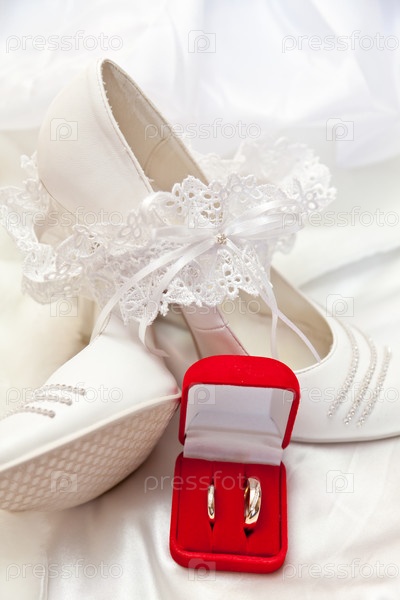 Свадебные туфли и обручальные кольца крупным планом