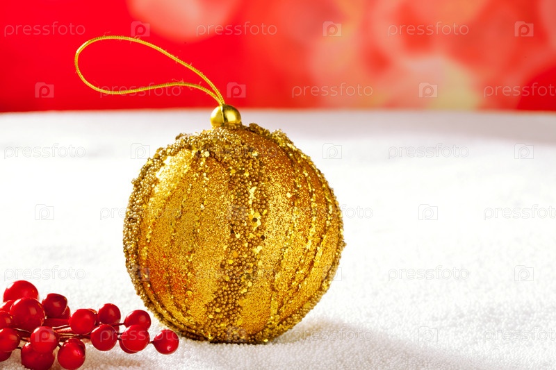 Рождественская открытка Золотой безделушка ягод на снег и красный фон