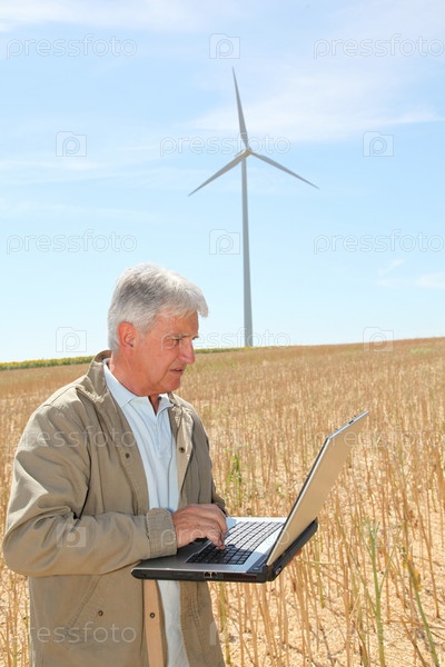 Агроном в пшеничном поле с портативного компьютера