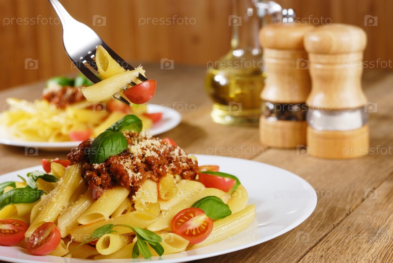 Ригатони макароны с томатным соусом говядина на дубовый стол
