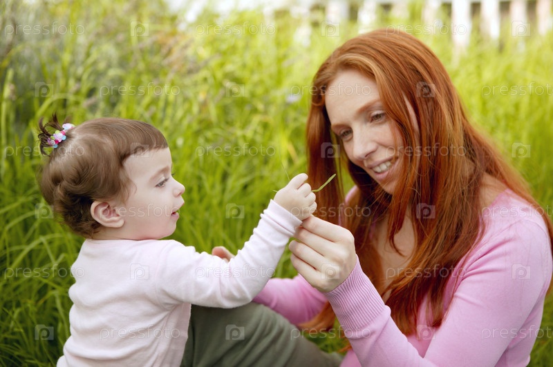 Ребенок и рыжая мать открытый трава, вместе играя парк