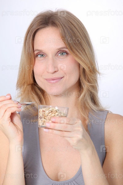 Крупным планом красивая блондинка женщина ест каши