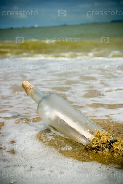 Бутылка с сообщением внутри моет на берег. Мельбурн, Австралия