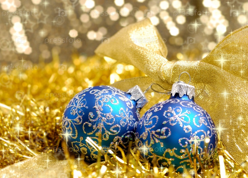 Голубые елочные шары и ленты над размытым фон, малую глубину резкости