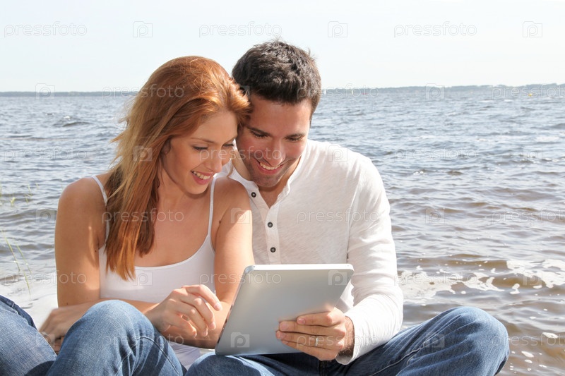 Пара, используя электронный планшет на берегу озера